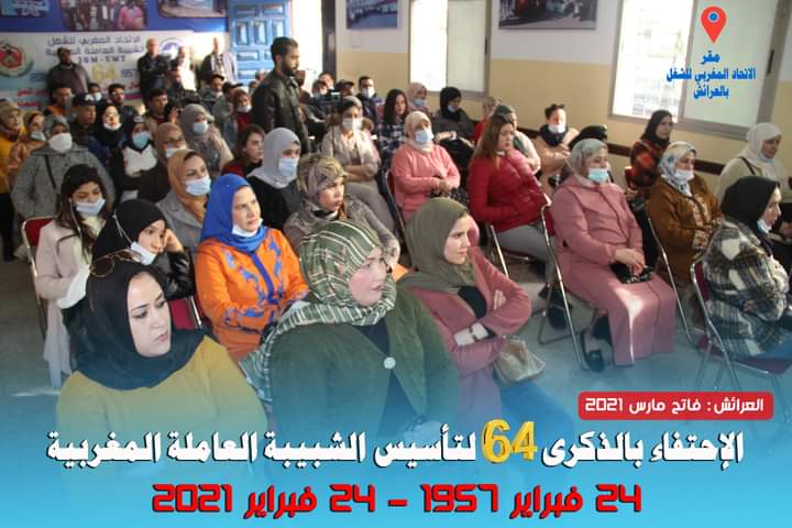 تحت شعار: “و يستمر النضال من أجل مستقبل آمن يضمن الحق في الكرامة و الديمقراطية الحقة و العدالة الاجتماعية”، احتفت الشبيبة العاملة المغربية، بالذكرى 64 لتأسيسها بمشاركة وفد يمثل المكتب الوطني للشبيبة العاملة المغربية و ذلك مساء يوم الاثنين 01 مارس 2021 بمقر الاتحاد المغربي للشغل بالعرائش.