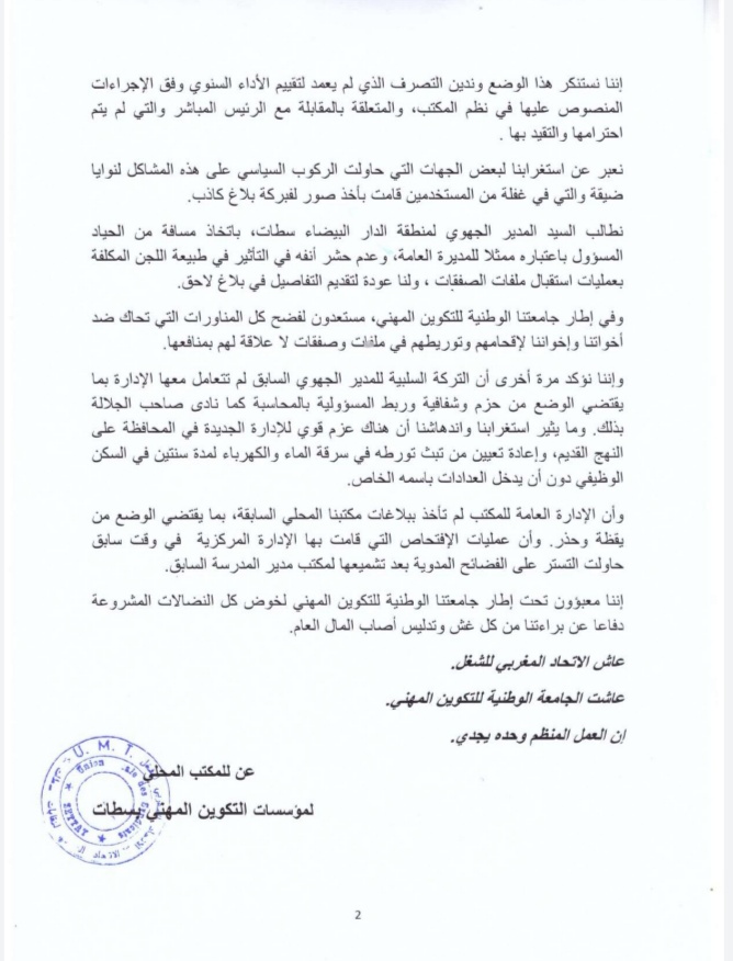 سطات: الضغوطات الممارسة على مستخدمي ومستخدمات مدرسة محمد السادس لمهن البناء والأشغال العمومية من طرف المدير