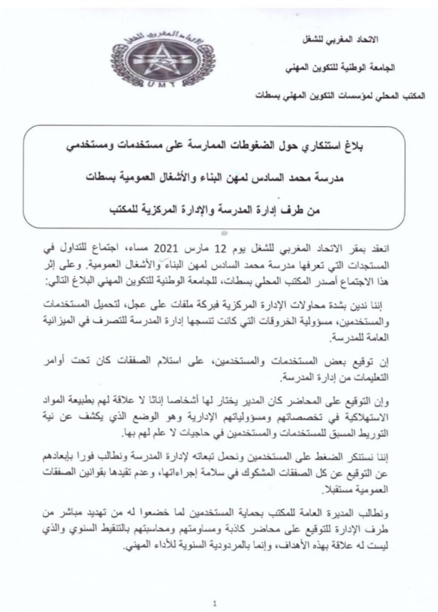 في اجتماع لمكتبهم النقابي، عبر مستخدمات ومستخدمي مدرسة محمد السادس لمهن البناء والانشغال العمومية بسطات عن قلقهم من جراء إقحام بعضهم في التوقيع على محاضر استيلام مواد التكوين التي لا تدخل في نطاق تخصصهم وقد عبر المكتب النقابي المنضوي تحت لواء الجامعة الوطنية للتكوين المهني ( الاتحاد المغربي للشغل )على أن هناك ضغوطات كانت تمارس على المستخدمين لدفعهم إلى التوقيع على محاضر لم تحترم فيها ضوابط قانون الصفقات العمومية.