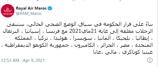 أعلنت الخطوط الملكية المغربية أنه بناءً على قرار الحكومة المغربية في سياق الوضع الصحي الحالي، فإن الرحلات ستبقى معلقة إلى غاية 21ماي2021 مع فرنسا ، إسبانيا ، البرتغال ، إيطاليا ، بلجيكا ، ألمانيا ، سويسرا ، هولندا ، تركيا ، المملكة المتحدة ، مصر ، الجزائر ، الكاميرون ، جمهورية الكونغو الديمقراطية ، غينيا كوناكري ، مالي ،غانا.