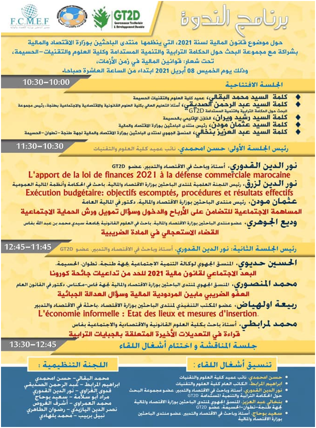 شهدت الندوة العلمية التي نظمها منتدى الباحثين بوزارة الاقتصاد والمالية بشراكة مع مجموعة البحث حول الحكامة الترابية والتنمية المستدامة وكلية العلوم والتقنيات-الحسيمة حول قانون المالية لسنة 2021، تحت شعار: قوانين المالية في زمن الأزمات، والتي انطلقت أعمالها حضوريا يوم أمس، بمقر الكلية سالفة الذكر وعبر تقنية الاتصال المرئي،، طرح العديد من الأفكار والرؤى حول قانون المالية لسنة 2021 والتبعات السلبية التي نجمت عن الأزمة الصحية الناجمة عن كوفيد 19.
