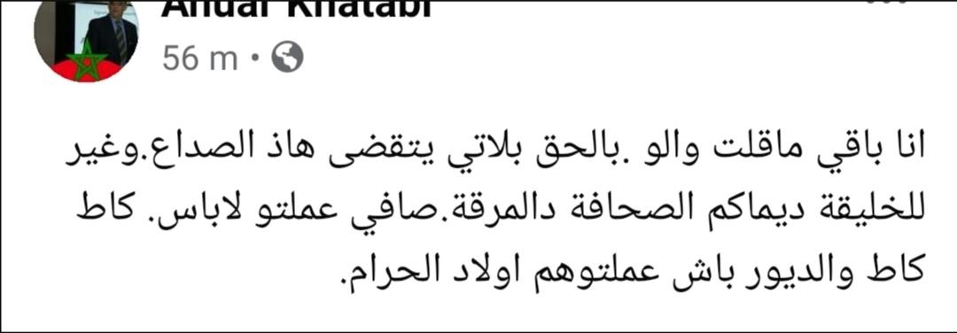 تأتي هذه التدوينة مباشرة بعد اعتقال شقيقه على خلفية ما بات يعرف بقضية عصابة مون بيبي السكايري بتطوان، حيث وصف الصحفيين بالمرايقية بشكل عام مستهلا تدوينته بعبارة (أنا باقي ما قلت والو) في إشارة منه إلى توفره على دلائل و معطيات تؤكد تورط الصحفيين في أفعال مشينة.