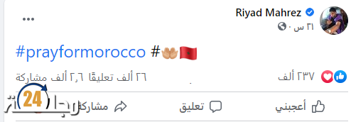 وقام بنشر رياض محرز “تدوينة” عبر حسابه الشخصي “فيسبوك” ، كتب فيها: “الصلاة من أجل المغرب”، مرفوقة بإمويجي رفع الأيدي للدعاء والعلم المغربي.