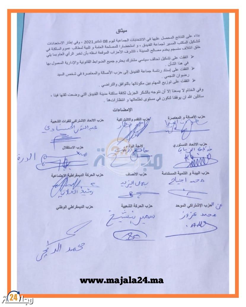 بناء على النتائج المحصل عليها في الانتخابات الجماعية ليوم 08 شتمبر 2022، وفي إطار التشكيل المكتب المسير لجماعة الفنيدق تم إصدار ميثاق شرف جمع كل أحزاب التي تحالفت على تشكيل المجلس الجماعي لمدينة الفنيدق ، واتفقوا على تشكيل سياسي مشترك يمجمع بين كل من حزب الاصالة ، وحزب التقدم و الاشتراكية،وحزب الاتحاد الاشتراكي ،وحزب الاتحاد الدستوري،ولائحة الوفاء،وحزب الاستقلال،حزب التنمية والبيئة والتنمية المستدامة، حزب الانصاف،حزب الحركة الديمقراطية الاجتماعية ،حزب الاشتراكي الموحد، وحزب الحركة الشعبية، وحزب الديمقراطي الوطني ،كما تم الاتفاق على منح رئاسة المجلس الجماعي للمرشح حزب الاصالة والمعاصرة السيد رضوان النجمي حسب ما في بيان الميثاق .