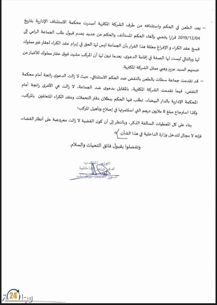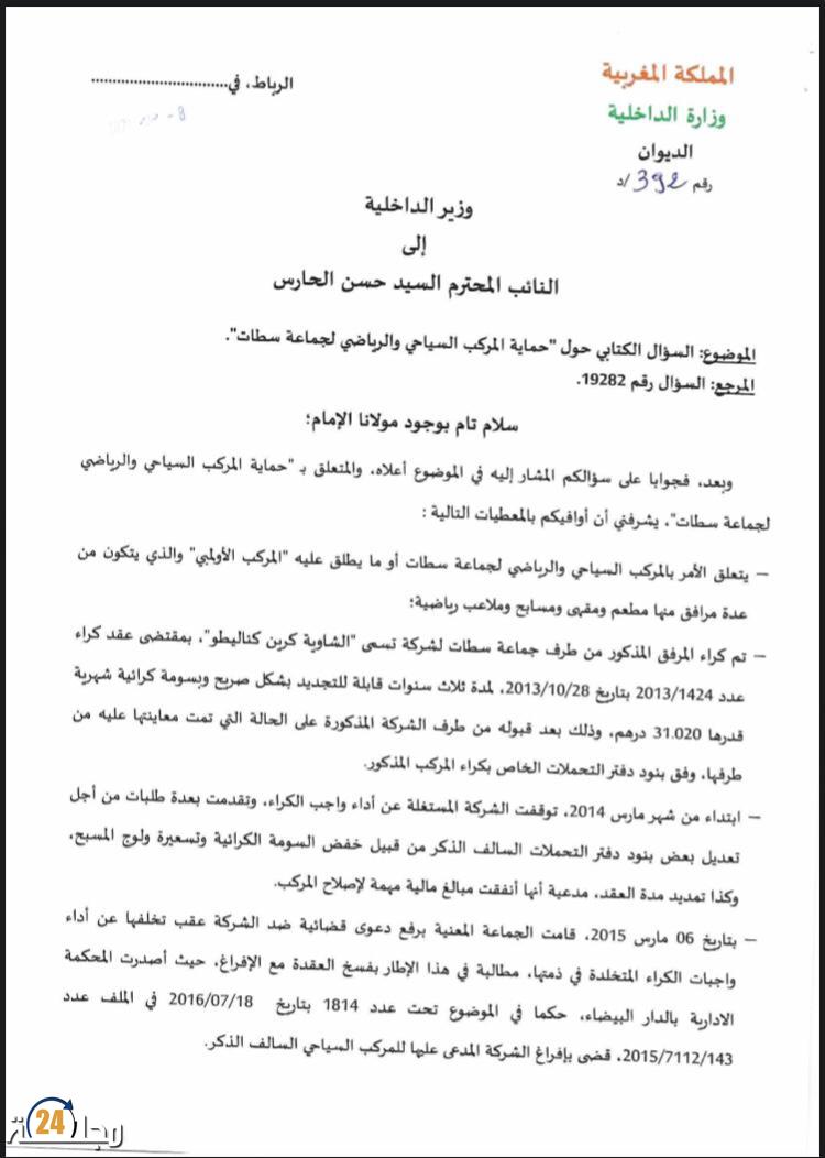في هذا الإطار ، و إذا كانت محكمة الاستئناف الإدارية قد حسمت إلى حد كبير في الملف لصالح الطرف المكتري ، رغم لجوء جماعة سطات إلى محكمة النقض ، و إصرار الشركة المعنية على التوجه للمحكمة الإدارية و رفع دعوى ضد الجماعة تطلب فيها الحكم ببطلان عقد الكراء و دفتر التحملات المتعلقين بالمركب ، زيادة على استرجاع 8 ملايين درهم التي استثمرتها في إصلاح و تأهيل المركب ، علما أن الملفين لازالا معروضين على أنظار القضاء ، فإن وزارة الداخلية أخلت مسؤوليتها للتدخل في هذا الشأن ، ، بحسب الوثيقة التي توصلت بها مجلة 24 .