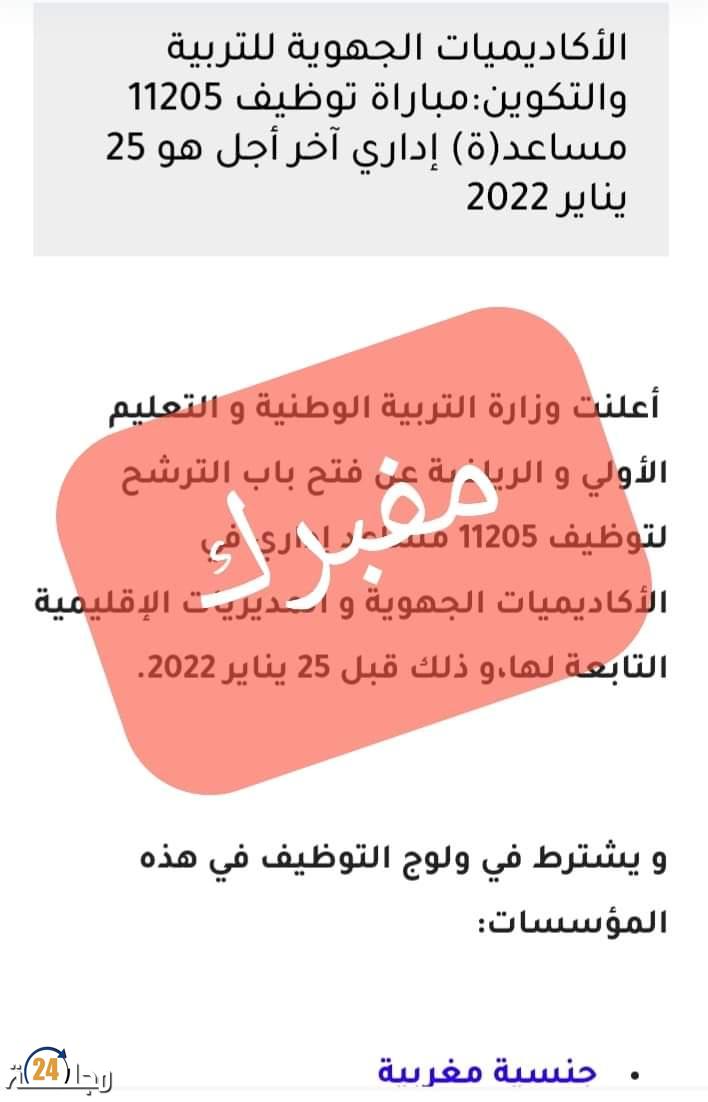 أوضحت وزارة التربية الوطنية أنه يتم تداول إعلان مفبرك منسوب إلى وزارة التربية الوطنية والتعليم الأولي والرياضة، بخصوص تنظيم مباراة توظيف 11205 مساعد (ة ) إداري بالاكاديميات الجهوية للتربية والتكوين والمديريات الاقليمية.