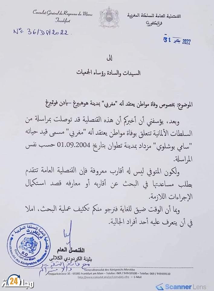 وذكرت المراسلة ان السلطات القنصلية المغربية بمدينة فراكنفورت الألمانية تبحث عن عائلة شاب مغربي توفي في ألمانيا يسمى قيد حياته “سامي بوشلوي، ولد في تطوان بتاريخ 01 شتنبر 2004، بحسب مراسلة وجهت لجمعيات الجالية المغربية بألمانية.