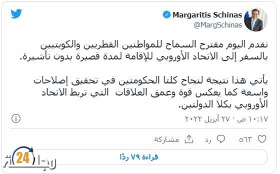 ونقلت وكالة “بلومبيرغ” للأنباء عن بيان أنه إذا ما وافق البرلمان الأوروبي ومجلس الاتحاد الأوروبي على مقترح المفوضية فلن يحتاج مواطنو قطر والكويت من حملة جوازات السفر البيومترية إلى تأشيرة عند السفر إلى الاتحاد الأوروبي لفترات إقامة قصيرة تصل إلى 90 يوما في كل 180 يوما، لأغراض العمل أو السياحة أو زيارة الأقارب.