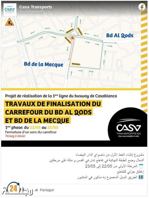 وفي هذا الصدد، أعلنت “كازا ترونسبور” أنه سيتم إغلاق جزئي لتقاطع شارعي القدس ومكة، لاستكمال أشغال وضع الطبقة النهائية في هذا التقاطع المحوري، حيث ستتم هذه الأشغال عبر مرحلتين، إذ ستمتد المرحلة الأولى من تاريخ 22/05/22 إلى 23/05/22. ودعت السائقين إلى سلك طريق بديل لتفادي ورش الأشغال.