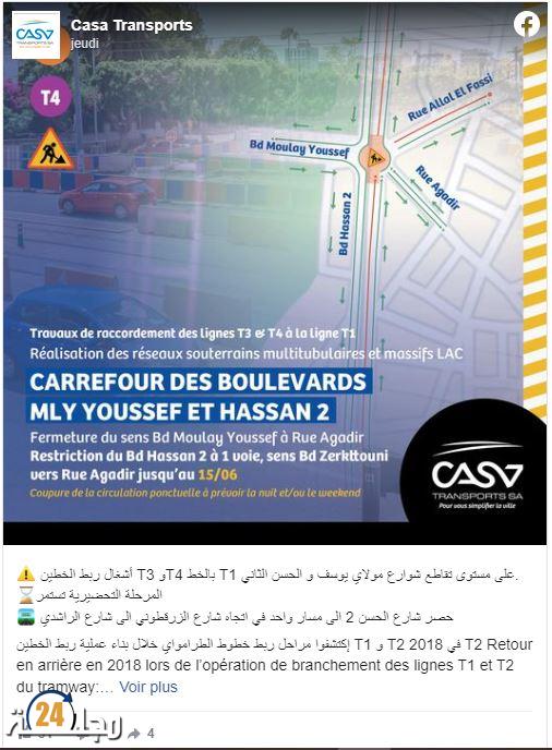 في السياق ذاته، أوضحت الشركة أنه سيتم حصر شارع الحسن الثاني في مسار واحد في اتجاه شارع الزرقطوني إلى شارع الراشدي، وذلك لفسح المجال للمرحلة التحضيرية لأشغال ربط الخطين 3 و4 بالخط 1 على مستوى تقاطع شوارع مولاي يوسف و الحسن الثاني.