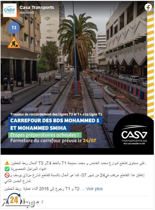 كما سيتم إغلاق تقاطع شوارع محمد الخامس ومحمد سميحة انطلاقا من الـ 24 يوليوز المقبل، بغرض استكمال ربط الخطين الثالث والرابع بالخط الأول على مستوى وسط المدينة.