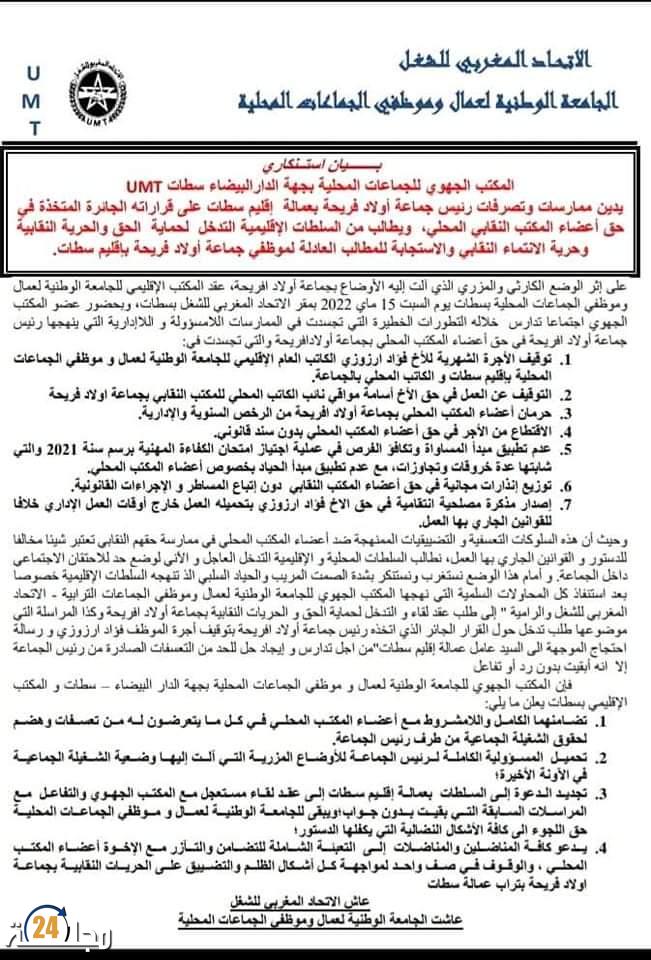 توصلت المجلة 24 بنسخة من بيان استنكاري للمكتبين الجهوي بالدار البيضاء سطات والإقليمي بسطات للجامعة الوطنية لعمال وموظفي الجماعات المحلية المنضوية تحت لواء الاتحاد المغربي للشغل ، حيث ورد في هذا البيان مجموعة من الممارسات اللامسؤولة كما وصفها البيان من خلال اتخاذ مجموعة من القرارات من طرف رئيس جماعة أولاد افريحة في حق أعضاء المكتب المحلي للنقابة بأولاد افريحة وذلك خارج إطار القانون بنية التضييق على العمل النقابي ، ومن بين ما ذكره البيان من القرارات التعسفية : توقيف الأجرة للكاتب الإقليمي والمحلي والتوقيف عن العمل لنائب الكاتب المحلي والاقتطاع من الأجر وتوزيع الإنذارات وإصدار مذكرة مصلحية لإرغام الكاتب الإقليمي للنقابة على العمل خارج أوقات العمل الجاري بها العمل بالإدارات العمومية والجماعات الترابية .