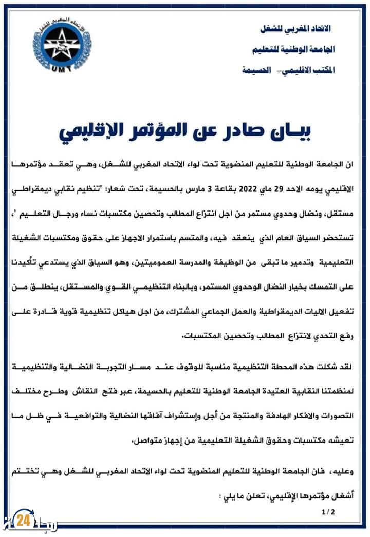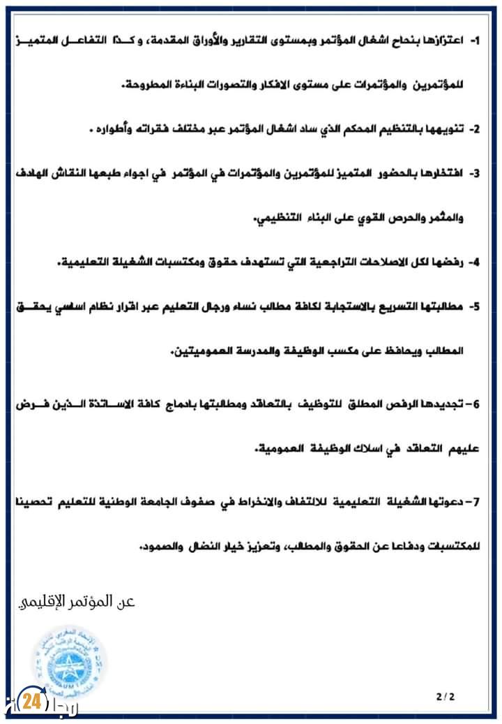 وعليه، فإن الجامعة الوطنية للتعليم المنضوية تحت لواء الاتحاد المغربي للشغل وهي تختتم أشغال مؤتمرها الإقليمي، تعلن للرأي العام ما يلي :