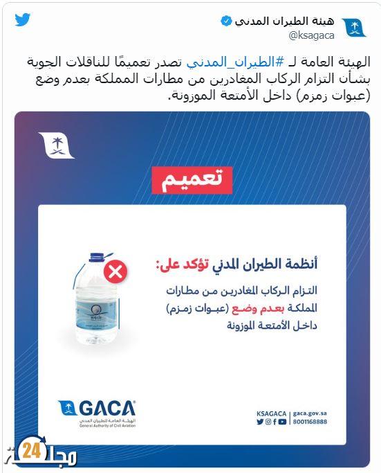 وينص التعميم الجديد على ضرورة “التزام الركاب المغادرين من مطارات المملكة بعدم وضع عبوات زمزم داخل الأمتعة الموزونة”.