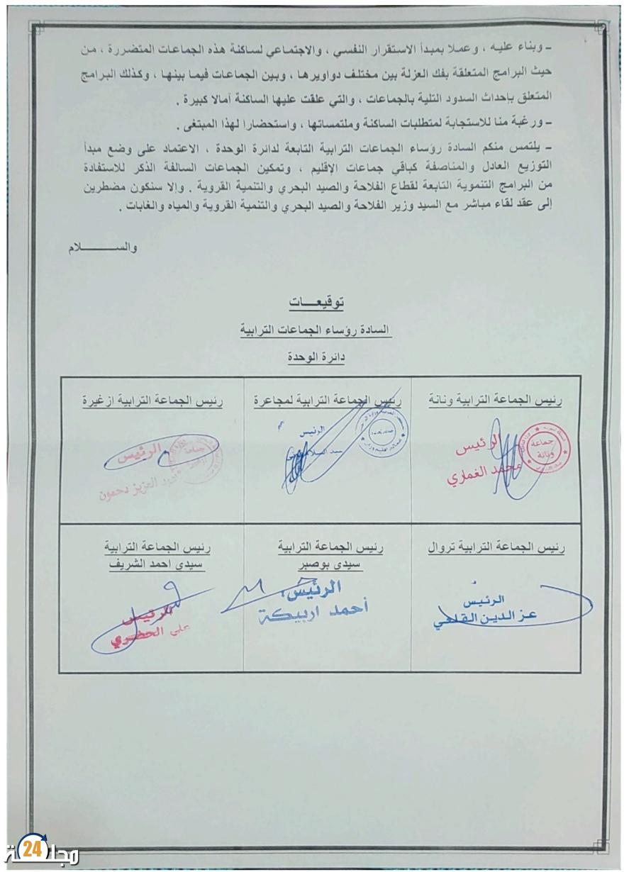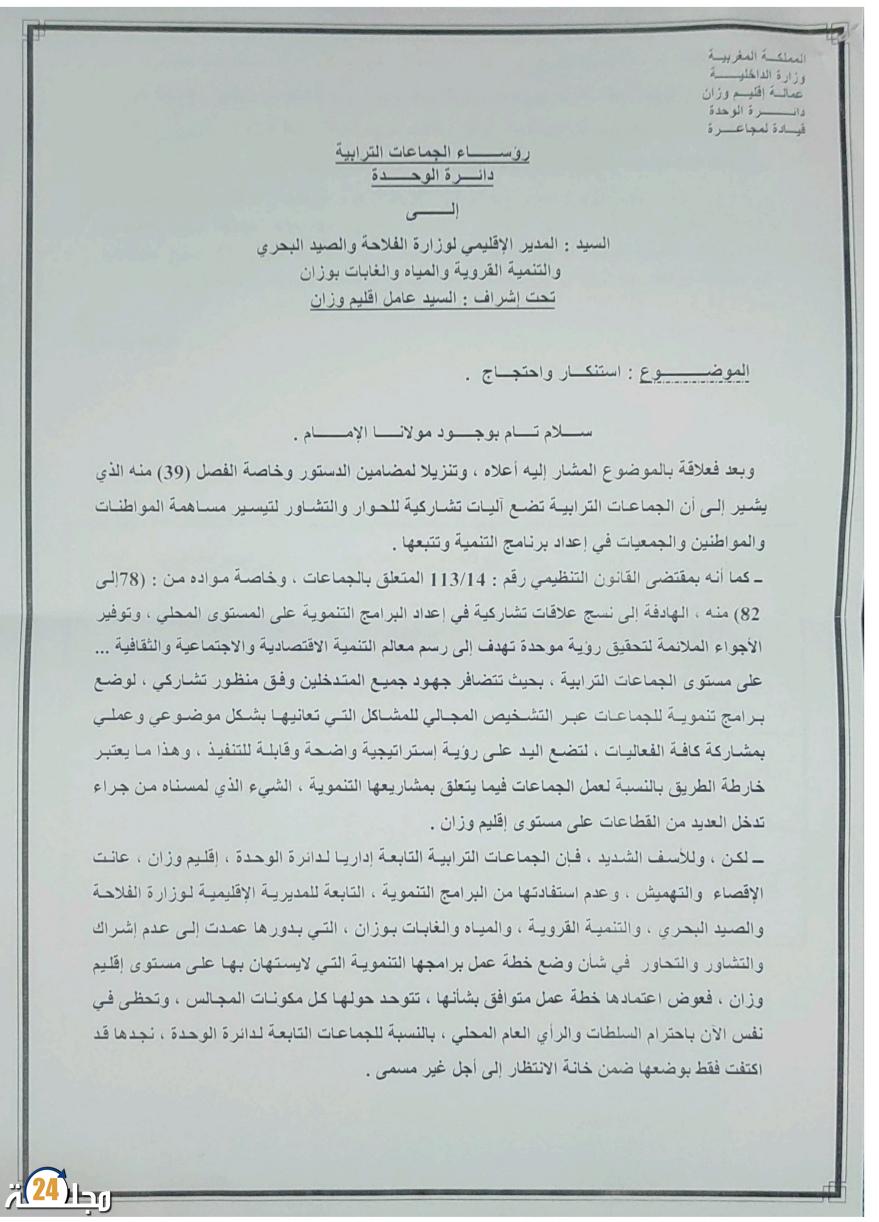 رسالة رؤساء جماعات الوحدة بإقليم وزان إلى ممثلي الأمة بسبب سياسة التهميش التي تنهجها الفلاحة و الصيد البحري بالمنطقة
