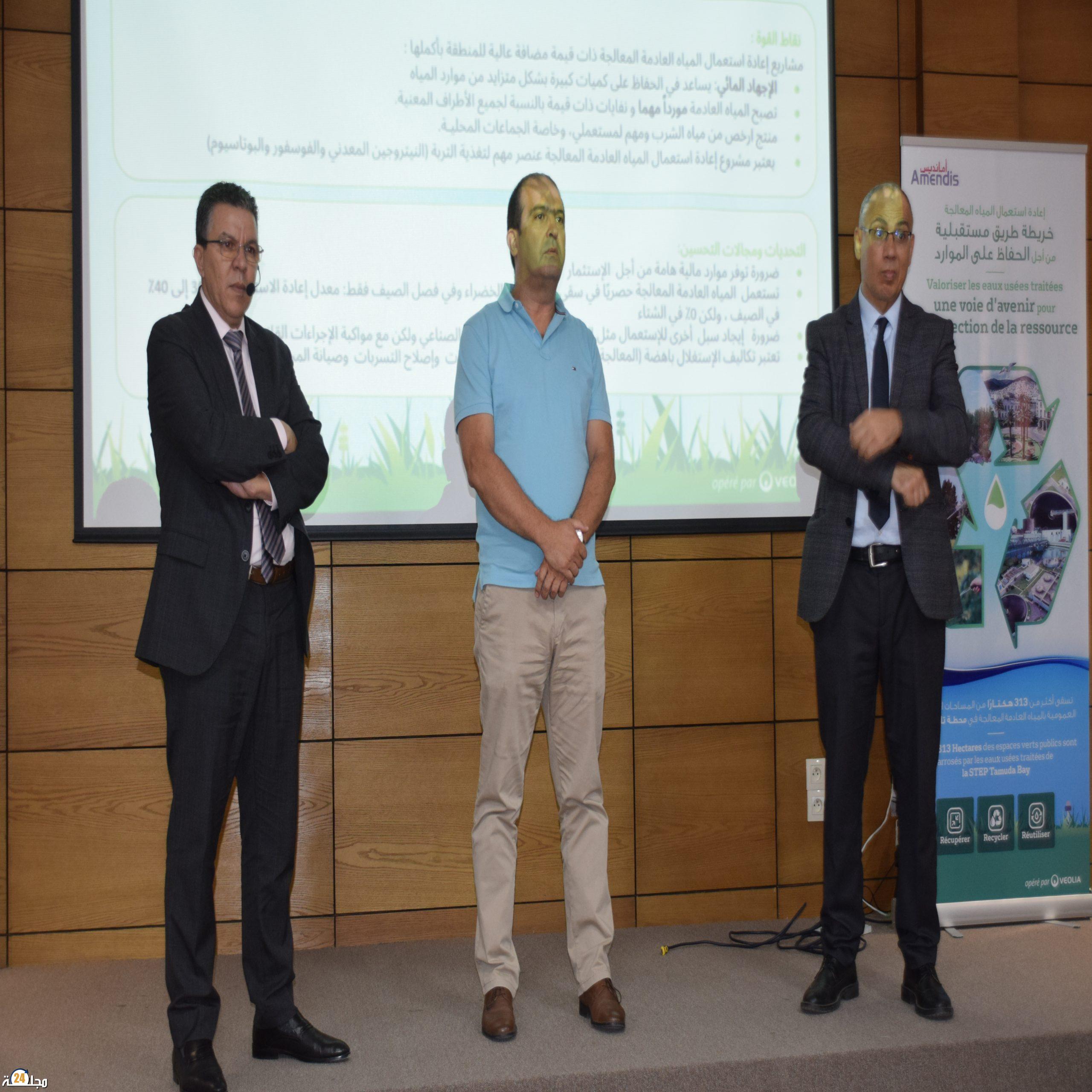 و انعرج المدير العملياتي لأمانديس في المحور الثاني، على الشق المتعلق بالقيام بعمليات تحسيسية وتوعوية، للمواطنين زبناء الشركة، حيث أكد على ضرورة ترشيد عملية استهلاك الماء، فيما أكد في محوره الثالث على أن الشركة تعمل على إعادة استعمال المياه العادمة عن طريق المعالجة و استعمالها في سقي المساحات الخضراء، والتي تم إنجازها عبر مرحلتين، أولها عبر محطة تموداباي لمعالجة المياه العادمة و التي تم إنجازها سنة 2016، حيث مكنت من المساهمة في الاقتصاد المائي بالمنطقة.