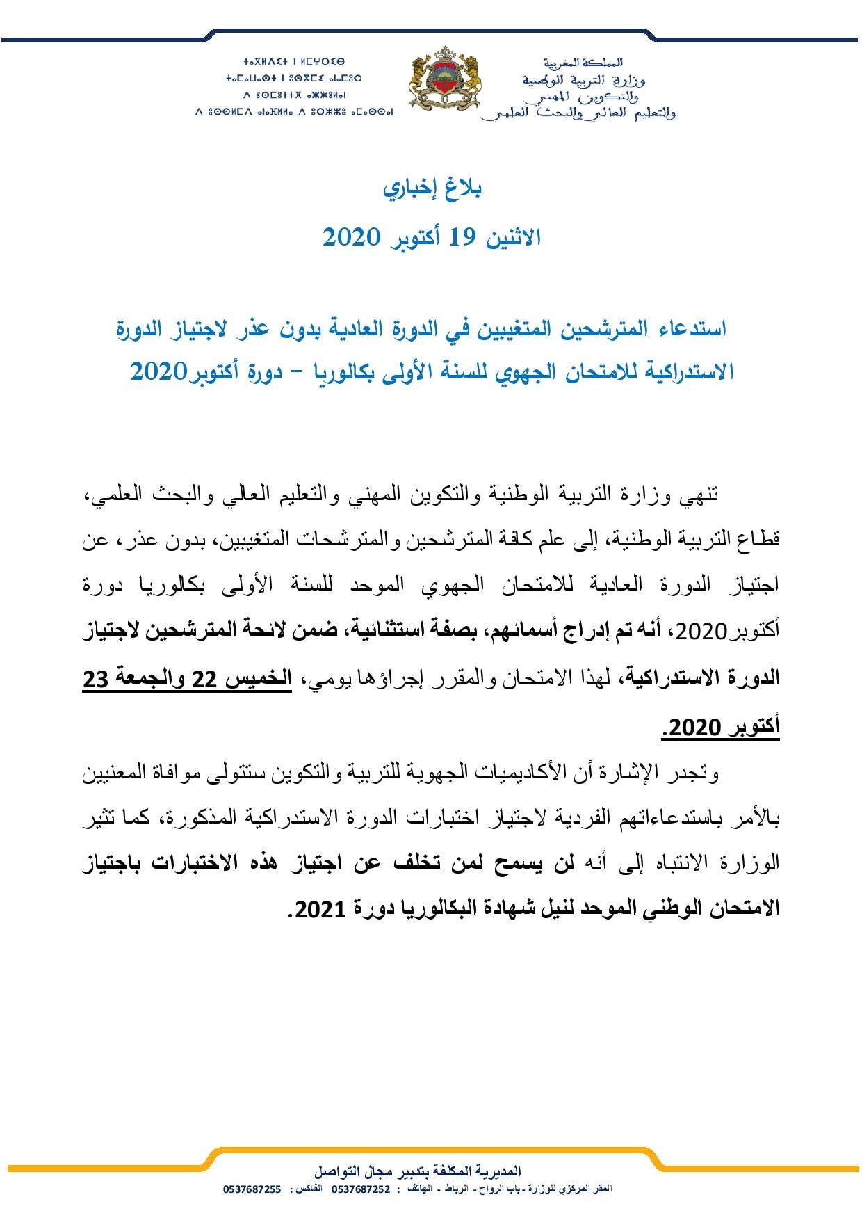 وأبرزت الوزارة، في بلاغ اليوم الاثنين، أنها ” تنهي إلى علم كافة المترشحين والمترشحات المتغيبين، بدون عذر، عن اجتياز الدورة العادية للامتحان الجهوي الموحد للسنة الأولى بكالوريا دورة أكتوبر 2020، أنه تم إدراج أسمائهم، بصفة استثنائية، ضمن لائحة المترشحين لاجتياز الدورة الاستدراكية، لهذا الامتحان والمقرر إجراؤها يومي الخميس 22 والجمعة 23 أكتوبر 2020 “.