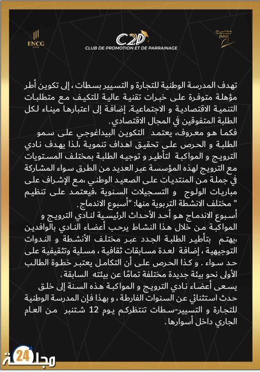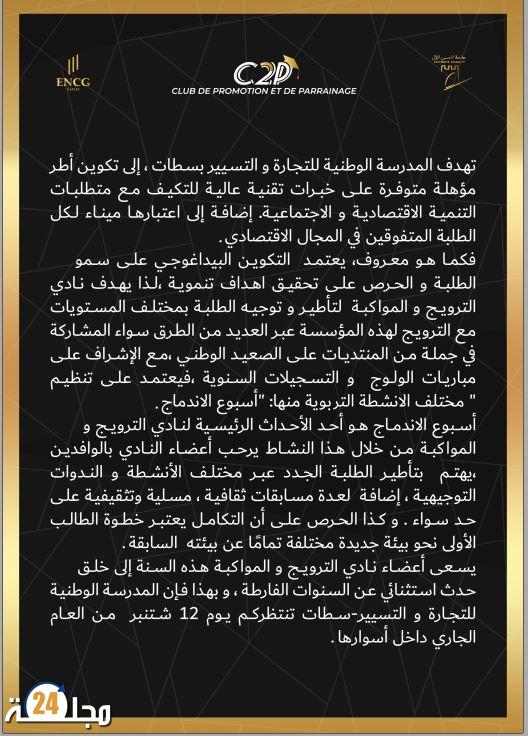 انطلاق فعاليات أسبوع الاندماج ب ENCG سطات 29 غشت، 2022 0 جهات Facebook Whatsapp Twitter طباعة تنظم المدرسة الوطنية للتدارة والتسيير بسطات، يوم 12 شتنبر 2022، أسبوع الإدماج برسم الموسم الجامعي 2022/2023. Post Views: 368 انطلاق فعاليات أسبوع الاندماج ب ENCG سطات