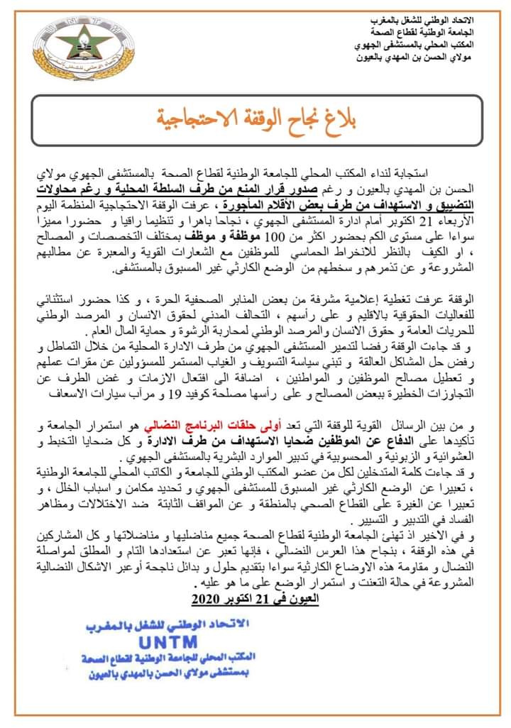 أصدرت الجامعة الوطنية لقطاع الصحة المنضوية تحث لواء الإتحاد الوطني للشغل عبر مكتبها المحلي بالمستشفى الجهوي مولاي الحسن بن المهدي بالعيون ، بلاغا مفصلا تعلن فيه عن نجاح الوقفة الاحتجاجية السلمية التي جرى تنظيمها اليوم الأربعاء 21 أكتوبر الجاري ، و ذلك من أجل التنديد بسوء التدبير الإداري للمستشفى المذكور و الأوضاع الكارثية التي بات يتخبط فيها من جهة ، و استنكار الممارسات التمييزية و التضييقية التي تنهجها الإدارة ضد بعض الموظفين من جهة أخرى.