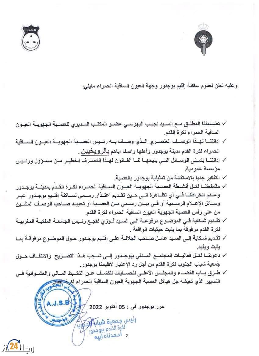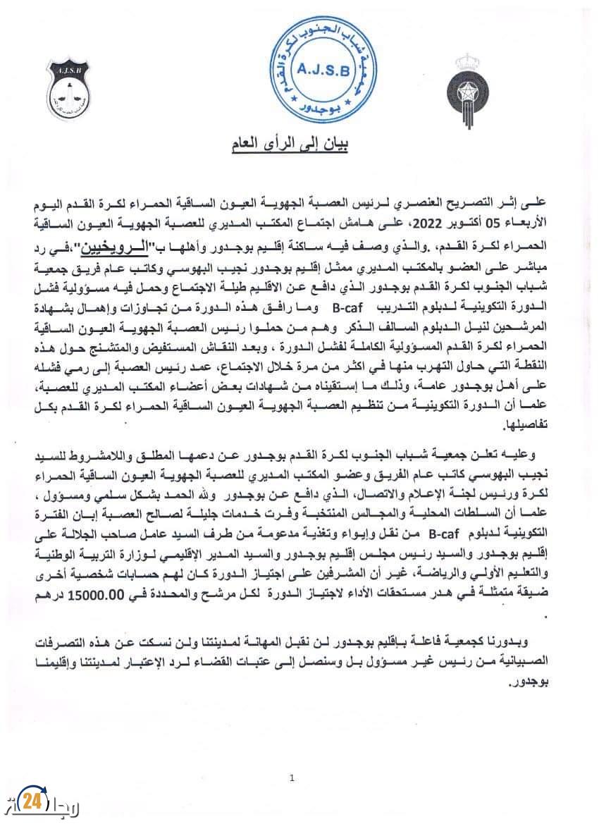 وجه نادي جمعية شباب الجنوب لكرة القدم ببوجدور ، بيانا للرأي العام ، يشرح من خلاله البعض من مجريات الاجتماع المديري لعصبة العيون الساقية الحمراء و مدار خلالها من جدال ، تبعه وصف عنصري صادر عن مدير العصبة تجاه ساكنة اقليم بوجدور حسب ما جاء في البيان .
