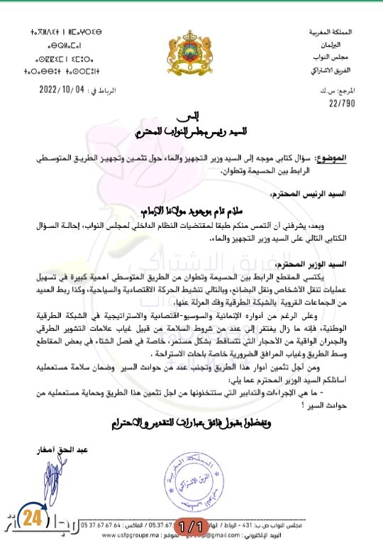 في إطار عمله الترافعي عن قضايا و انشغالات ساكنة الإقليم، وجه البرلماني عبد الحق أمغار البرلماني عن إقليم الحسيمة سؤالا كتابيا لوزير التجهيز والماء حول وضعية المقطع الرابط بين الحسيمة وتطوان من الطريق المتوسطي، التي حسب البرلماني تكتسي أهمية كبيرة في تسهيل عمليات تنقل الأشخاص ونقل البضائع، و في تنشيط الحركة الاقتصادية والسياحية، وكذا ربط العديد من الجماعات القروية بالشبكة الطرقية وفك العزلة عنها، حسب قوله فبالرغم من أدوار هذا الطريق الإنمائية والسوسيو-اقتصادية والاستراتيجية في الشبكة الطرقية الوطنية، فإنه ما زال يفتقر إلى عدد من شروط السلامة من قبيل غياب علامات التشوير الطرقي والجدران الواقية من الأحجار التي تتساقط بشكل مستمر، خاصة في فصل الشتاء في بعض المقاطع وسط الطريق وغياب المرافق الضرورية خاصة باحات الاستراحة كما جاء في نص السؤال الموجه .