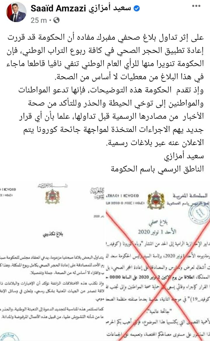 نفى الناطق الرسمي باسم الحكومة سعيد أمزازي على صفحته الرسمية بالفايسبوك خبر عودة المملكة إلى الحجر الصحي بسبب تزايد عدد المصابين و الوفيات بسبب جائحة كورونا.