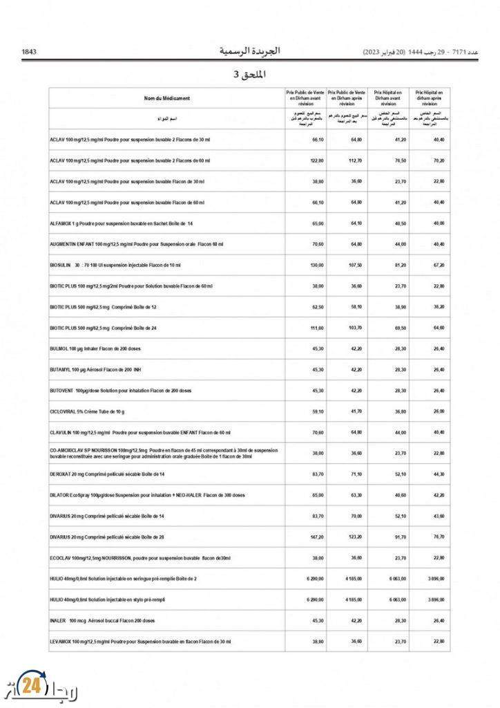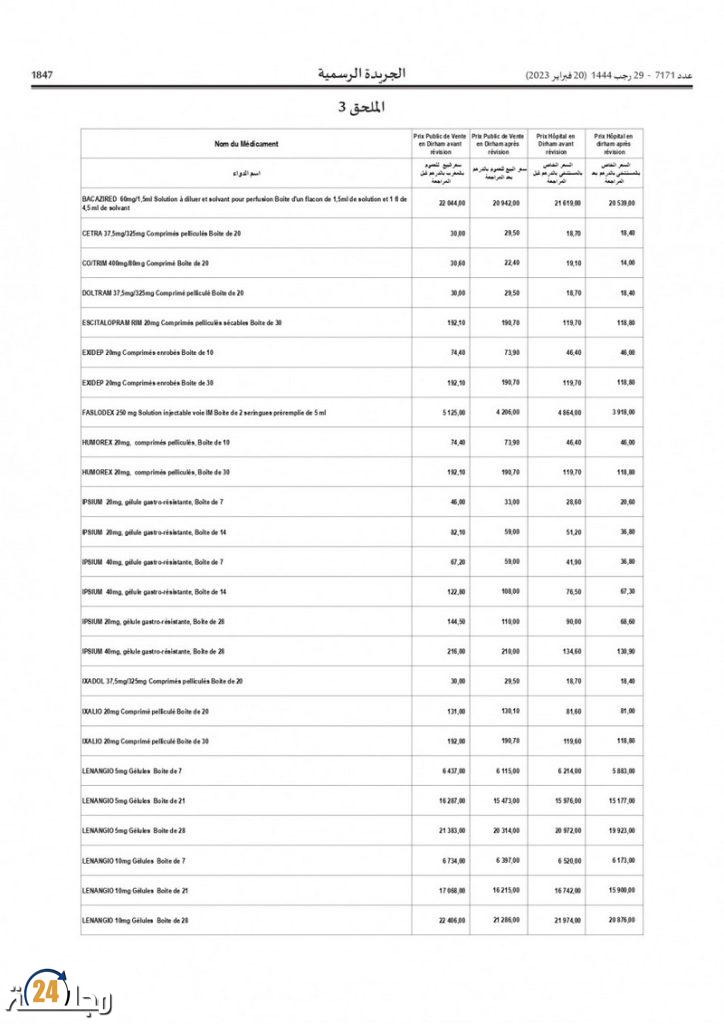 وفي هذا الإطار، صدر بالعدد الأخير للجريدة الرسمية قرار لوزير الصحة والحماية الاجتماعية، خالد آيت الطالب، يقضي بتغيير وتتميم القرار المتعلق بمراجعة أسعار البيع للعموم للأدوية الأصلية والجنيسة والمماثلة الحيوية المسوقة في المغرب.