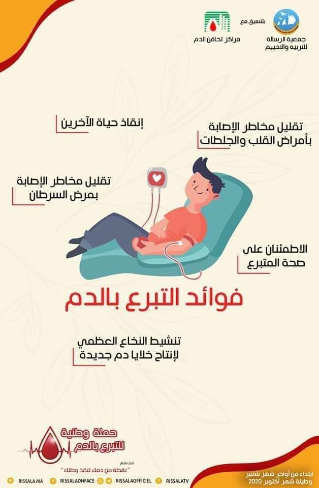 يعلن مكتب جمعية الرسالة للتربية والتخييم فرع تطوان عن تنظيم حملة للتبرع بالدم بتنسيق مع مركز تحاقن الدم الجهوي لتطوان تحت شعار ” نقطة من دمك تنقذ وطنك “.. يوم الإثنين 9 نونبر 2020 ابتداء من 10:00 صباحا بالمركز الجهوي لتحاقن الدم – سانية الرمل – تطوان تنزيلا للحملة الوطنية التي دعى لها المكتب الوطني للجمعية .