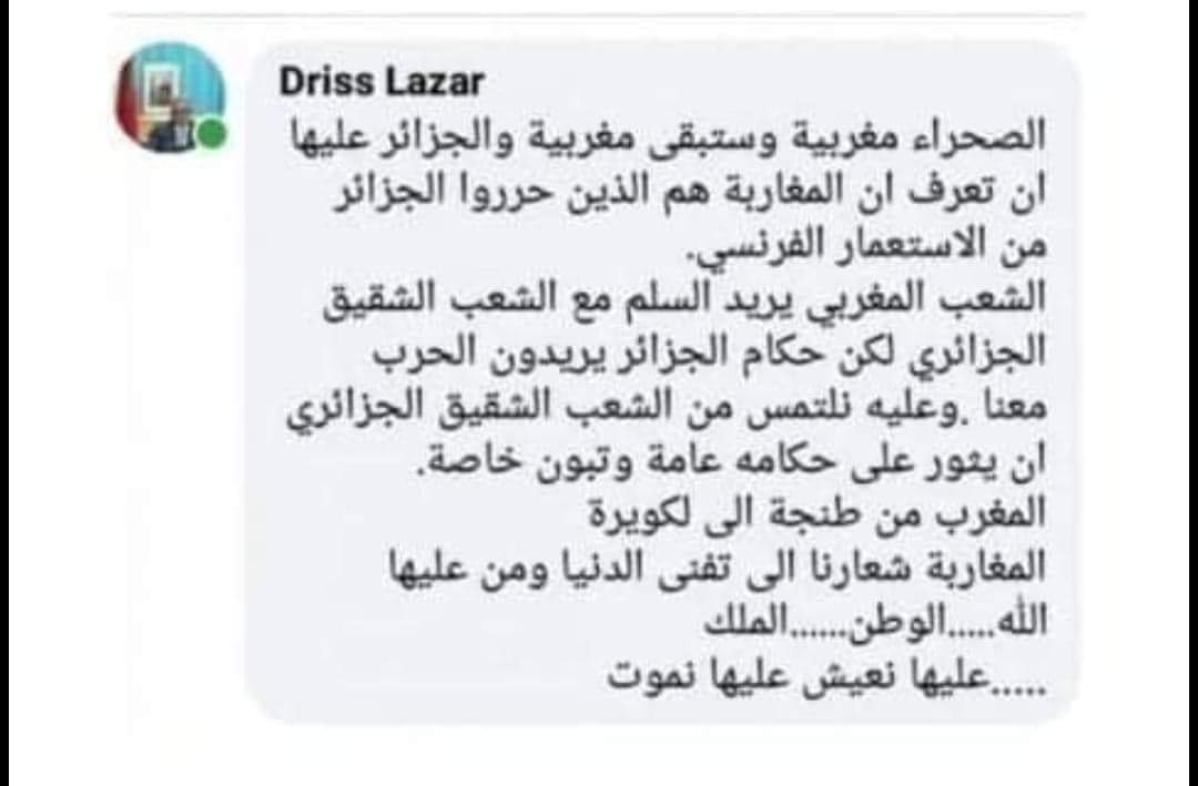 في خرجة مستفزة و ماسة بطبيعة العلاقات بين دولتين جارتين خرج علينا رئيس بلدية المضيق مؤخرا بتدوينة له على صفحته الشخصية تدعوا الشعب الجزائري إلى القيام بثورة ضد حكامه دون إحترام لبلد شقيق قد نختلف معه دبلوماسيا لكن دون إتخاد مواقف بشأن القضايا الدولية، لأن ذلك من مهام و إختصاصات الحكومة الممثلة في وزارة الخارجية، فهذا التصرف غير المسؤول و الأرعن و المتهور لا يخدم أبدا العلاقات المغربية الجزائرية مما يستوجب على السلطات المغربية إتخاد التدابير المناسبة لتفادي أية تداعيات لهذا الحادث نظرا لأن صاحب التدوينة هو رئيس بلدية منتخب يمثل جماعة.