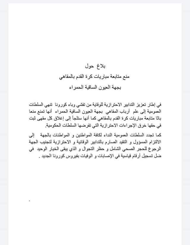 في إطار تعزيز التدابير الإحترازية للوقاية من تفشي وباء كورونا تنهي السلطات العمومية إلى علم أرباب المقاهي بجهة العيون – الساقية الحمراء، أنها تمنع منعا باتا متابعة مباريات كرة القدم بالمقاهي، كما أنها ستلجأ إلى إغالق كل مقهى ثبت في حقها خرق الإجراءات الإحترازية التي تفرضها السلطات الحكومية.