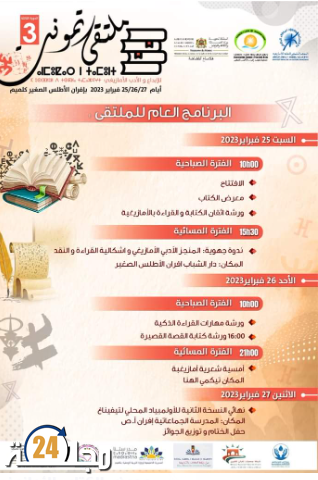 وسيعرف برنامج الدورة الثالثة تنظيم ندوة جهوية ستشهد مداخلات حول المنجز الأدبي الأمازيغي بمشاركة الباحث و الأديب الحسن زهور و الباحث الناقد أحمد بوزيد و الباحث الحسن تيكبدار إضافة الى شهادة الكاتب صالح أيت صالح حول تجربته في الكتابة الابداعية.
