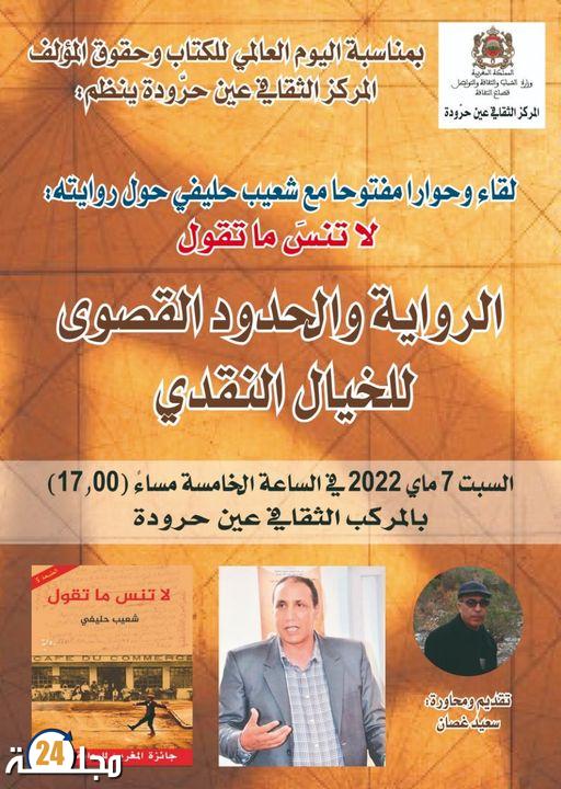 نظم المركب الثقافي عين حرودة بمناسبة اليوم العالمي للكتاب وحقوق المؤلف، مؤخرا، لقاء وحوارا مفتوحا مع الروائي شعيب حليفي حول روايته “لا تنس ما تقول” ، بعنوان “الرواية والحدود القصوى للخيال النقدي”.