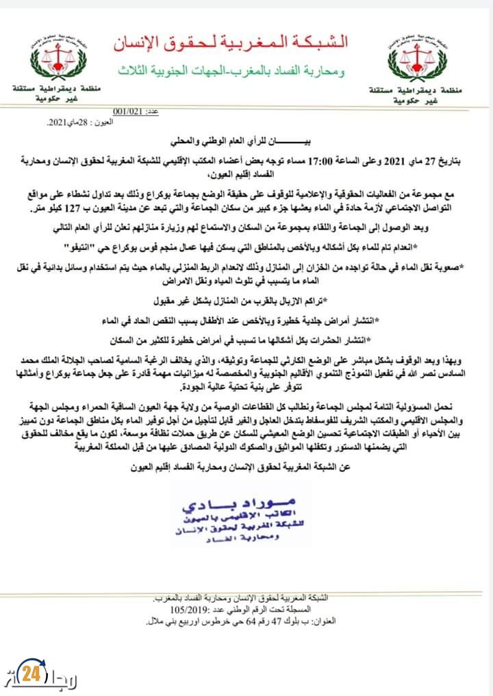 وجهت الشبكة المغربية لحقوق الانسان و محاربة الفساد بالجهات الجنوبية الثلاث بيانا الرأي العام الوطني و المحلي ، بعد الزيارة الميدانية التي قام بها وفد يضم أعضاء من المكتب الجهوي رفقة حقوقيين و إعلامين لجماعة بوكراع ، بعد أن طفى ملف نقص و شح الماء كمادة أساسية للحياة ، الجمعية الحقوقية حسب البيان قامت بمعاينة مجموعة من الاختلالات منها ، ضعف صبيب الماء و عدم توفره في كثير من الأحيان ، واصفين الوضع بالا إنساني ، حيث يقوم سكان المنطقة بالإستعانة بوسائل بدائية في نقل الماء صوب محال سكناهم ، ما يجعل تلوث الماء سببا في إصابة الأطفال بمجموعة من الأمراض خصوصا الجلدية منها .