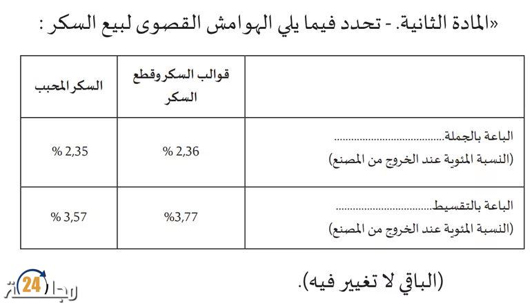زيادة على ذلك، فقد حدد القرار الهوامش القصوى لبيع السكر بالنسبة لباعة الجملة، في 2,36 بالمائة بالنسبة لمنتوج قوالب السكر وقطع السكر، و2,35 بالمائة بالنسبة للسكر المحبب، ولباعة التقسيط، في 3.77 بالمائة بالنسبة لقوالب السكر وقطع السكر، و3.57 بالمائة بالنسبة للسكر المحبب.