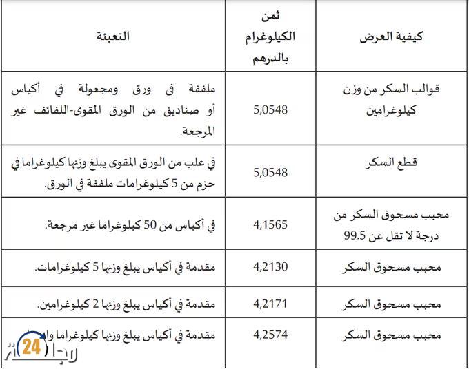 وحدد القرار، سعر قوالب السكر من وزن كيلوغرامين (الملففة في ورق ومجعولة في أكياس أو صناديق من الورق المقوى-اللفائف غير المرجعة)، وقطع السكر (الموضوعة في علب من الورق المقوى يبلغ وزنها كيلوغراما في حزم من 5 كيلوغرامات ملففة في الورق)، عند خروجها من المصنع في 5,0548 دراهم، بزيادة قدرها 0.5 درهم.