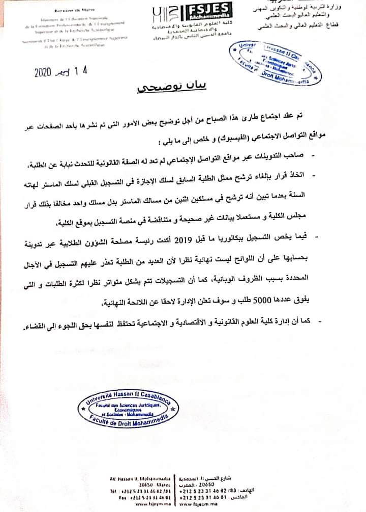إدارة كلية الحقوق بالمحمدية توضح بخصوص الاتهامات التي وجهها ممثل الطلبة السابق 14 دجنبر، 2020 0 مجتمع Facebook Whatsapp Twitter طباعة Post Views: 164