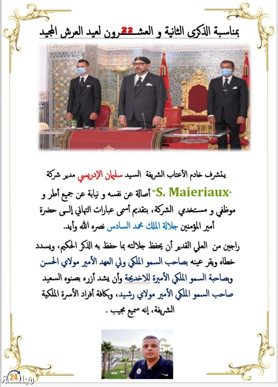 المدير العام لشركة s.maieraux السيد سليمان الادريسي يهنئ جلالة الملك محمد السادس بمناسبة الذكرى 22 لعيد العرش المجيد 30 يوليوز، 2021 0 مجتمع Facebook Whatsapp Twitter طباعة Post Views: 168