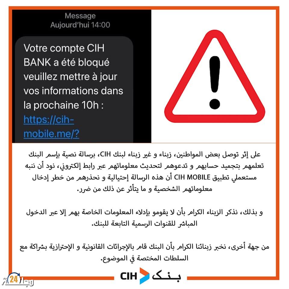 وقال البك في بلاغ له، “على إثر توصل بعض المواطنين، زبناء وغير زبناء لبنك CIH، برسالة نصية باسم البنك، تعلمهم بتجميد حسابهم وتدعوهم لتحديث معلوماتهم عبر رابط إلكتروني، نود أن ننبه مستعملي تطبيق CIH MOBILE أن هه الرسالة احتيالية”.