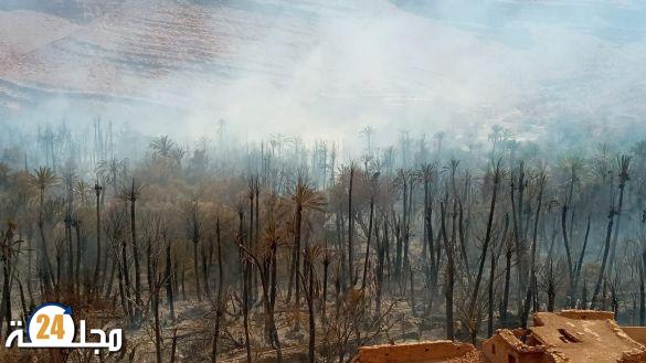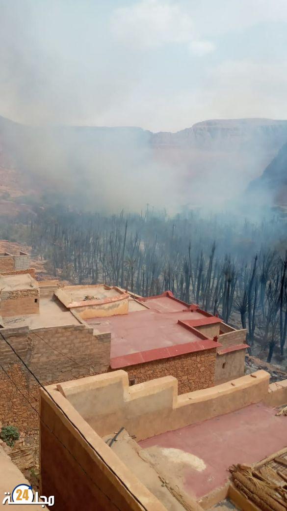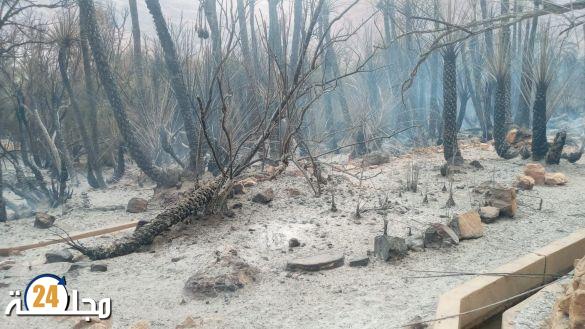والتهمت النيران المئات من أشجار النخيل والزيتون والرمان وحولتها إلى رماد أمام أعين السكان الذين أعربوا عن حسرتهم تجاه ما يقع، وكل أمنياتهم، تقول مصادرنا، أن يتم تطويق الحريق لتفادي الخسائر البشرية.