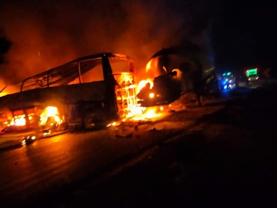 وأظهرت صور متداولة على مواقع التواصل الاجتماعي تفحم الحافلة حيث احترقت تماما بعد الاصطدام بالسيارة.