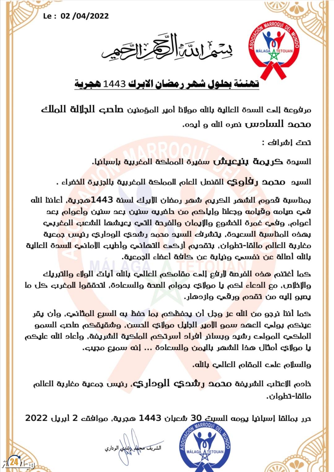 قام السيد محمد رشدي الوداري رئيس جمعية مغاربة العالم مالقا تطوان والتي يتواجد مقرها الرئيسي بمدينة مالقا الإسبانية ببعث برقية تهنئة بمناسبة حلول شهر رمضان المبارك أصالة عن نفسه ونيابة عن كل أعضاء ومنخرطي الجمعية للسدة العالية بالله أمير المؤمنين صاحب الجلالة الملك محمد السادس نصره الله وآيده .