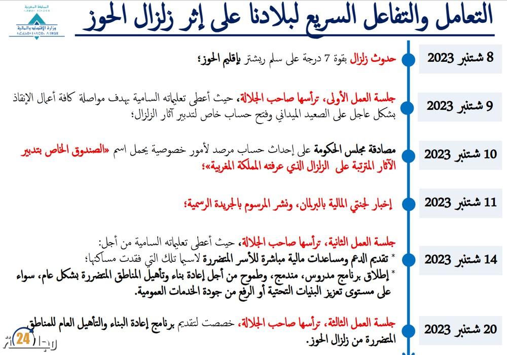 وهكذا، أعطى جلالة الملك، خلال جلسة عمل أولى ترأسها جلالته يوم 9 شتنبر الجاري، تعليماته السامية بهدف مواصلة كافة أعمال الإنقاذ بشكل عاجل على الصعيد الميداني وفتح حساب خاص لتدبير آثار الزلزال.