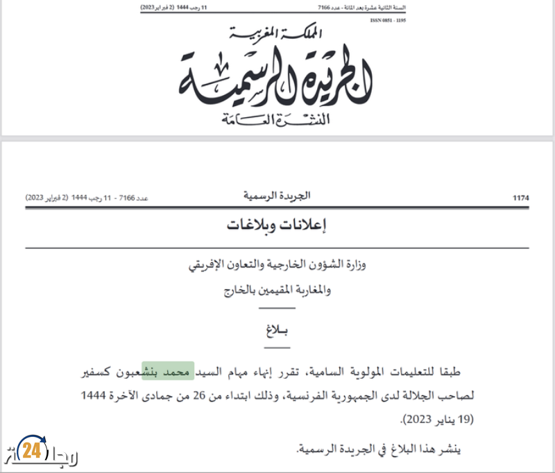 وجاء في بلاغ لوزارة الشؤون الخارجية والتعاون الإفريقي والمغاربة المقيمين بالخارج، نشر بالجريدة الرسمية رقم 7166، بتاريخ 2 فبراير 2023،” انه طبقا للتعليمات المولوية السامية، تقرر إنهاء مهام السيد محمد بنشعبون كسفير لصاحب الجلالة لدى الجمهورية الفرنسية، وذلك ابتداء من 26 من جمادى الآخرة 1444 هجرية، 19 يناير 2023، وينشر هذا البلاغ في الجريدة الرسمية”.
