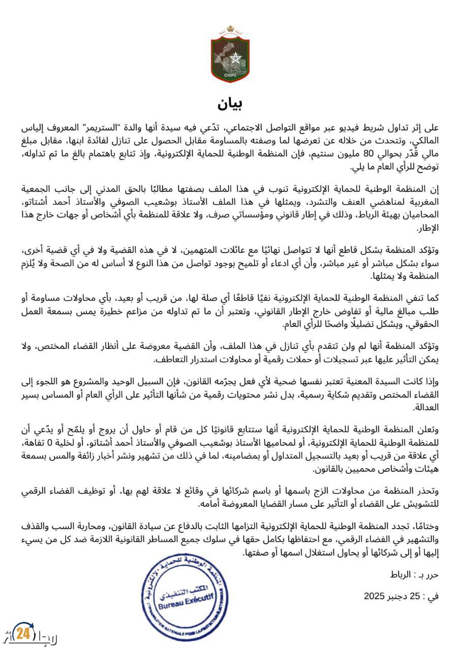 أصدرت المنظمة الوطنية للحماية الإلكترونية بيانًا رسميًا توضيحيًا إلى الرأي العام، وذلك بعد انتشار شريط فيديو على مواقع التواصل الاجتماعي تزعم فيه إحدى السيدات أنها والدة “الستريمر” المعروف إلياس المالكي، وأنها تعرضت لمساومة مالية مقابل الحصول على تنازل لفائدة ابنها بمبلغ يقدر بحوالي 80 مليون سنتيم.