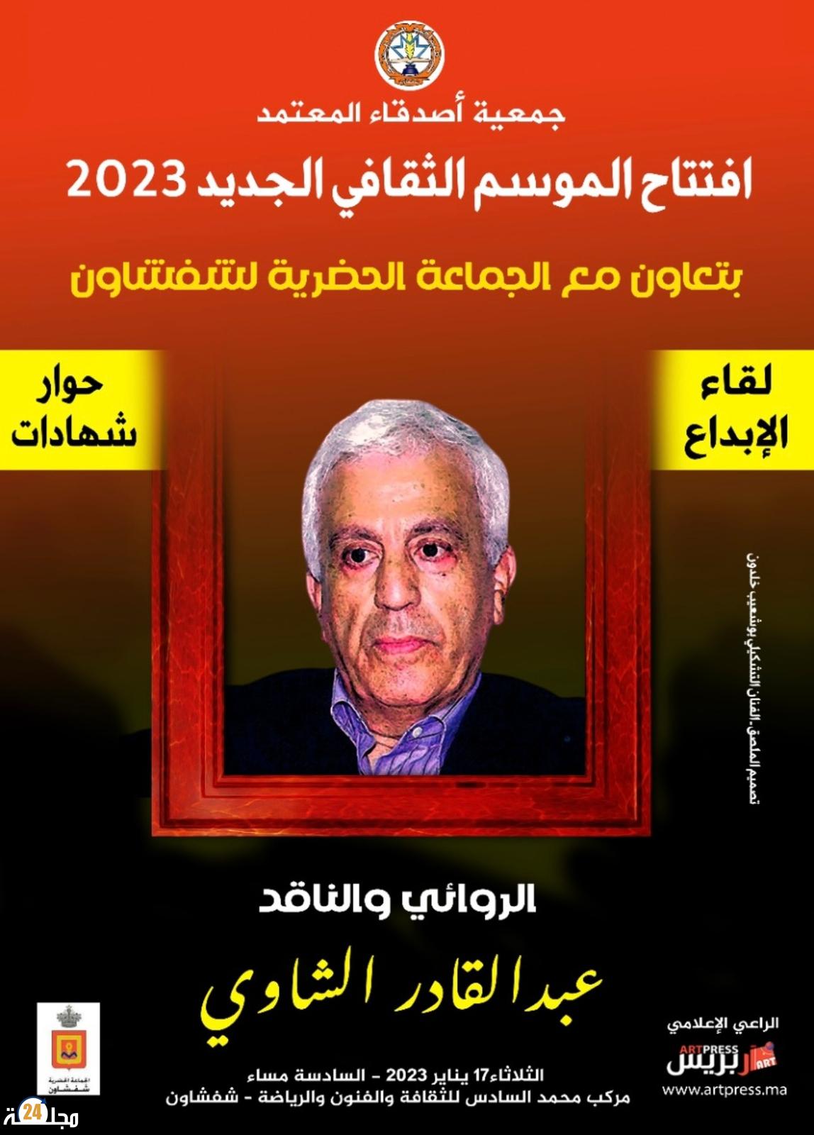 تستضيف جمعية أصدقاء المعتمد في افتتاح موسمها الثقافي يوم الثلاثاء17 يناير 2023 على الساعة السادسة مساء بقاعة المحاضرات بمركب محمد السادس للثقافة والفنون والرياضة بمدينة شفشاون، ضمن “لقاء الابداع” الروائي والناقد المغربي عبدالقادر الشاوي.