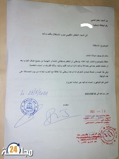 توصل المكتب الإقليمي لحزب الاستقلال قبل أيام قليلة من استحقاقات 2021 ، باستقالة العضو الجماعي البارز بجماعة برشيد ، جليل لحدبي ، و ذلك لأسباب و ظروف يعتبرها شخصية بحسب الاستقالة التي توصلت مجلة 24 بنسخة منها.