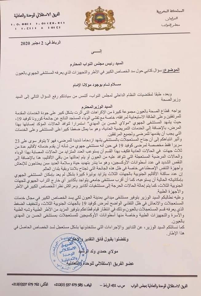 تقدم النائب البرلماني عن دائرة العيون السيد حمدي ولد الرشيد بسؤال كتابي لوزير الصحة عن التدابير المتخذة لسد الخصاص الحاصل في الأطر الطبية و التمريضية و المعدات خصوصا بعد تسجيل جهة العيون من ارتفاع بأعداد الإصابة و الوفيات ، كما جاء بالسؤال الحديث عن النقص الحاصل بمادة الاوكسجين .