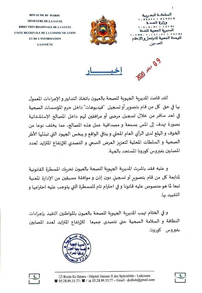 توصلت مجلة 24 بإخبار للمديرية الجهوية للصحة بجهة العيون تعلن من خلاله تحريك المتابعة في حق من قام بتصوير مرضى او مرافقيهم داخل حرم المؤسسة الصحية بشكل يمس من مجهودات الإدارة الصحية و السلطات المحلية في التصدي لجائحة كورونا خصوصا مع تزايد أعداد المصابين .