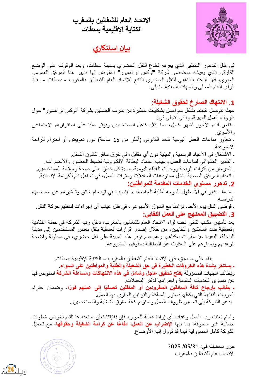 تصاعد الأصوات النقابية والمجتمعية للمطالبة برحيل شركة “لوكس ترانسبور” من سطات