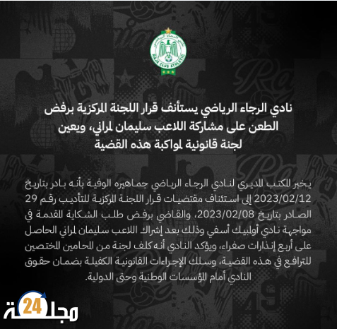 أعلن فريق الرجاء الرياضي لكرة القدم، عبر بلاغ رسمي أنه استأنف مقتضيات قرار اللجنة المركزية للتأديب، والقاضي برفض طلب الشكاية المقدمة في مواجهة نادي أولمبيك أسفي، وذلك بعد إشراك اللاعب سليمان لمراني.